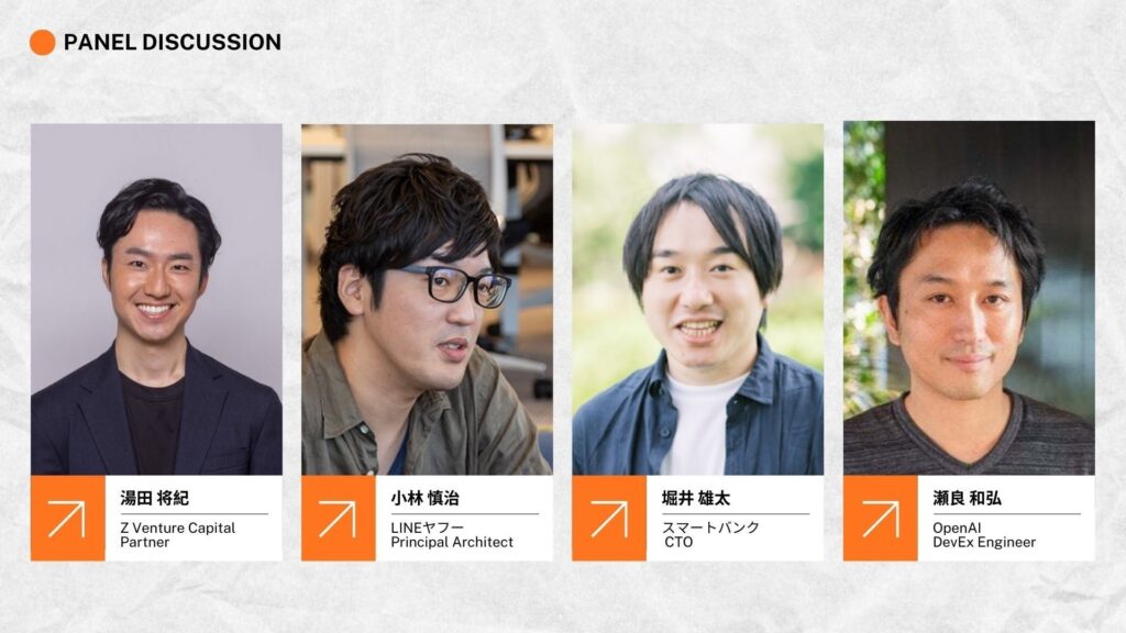 続いて、LINEヤフーの小林慎治さん(@kobashinG)、スマートバンクの堀井雄太さん( @yutadayo)、OpenAI Japanの瀬良さんが登壇したパネルディスカッションでは、ZVCの湯田 将紀(@yudamasak1)がモデレーターを務め、「AI活用の現在地とこれからのプロダクト開発」をテーマに議論を行いました。
